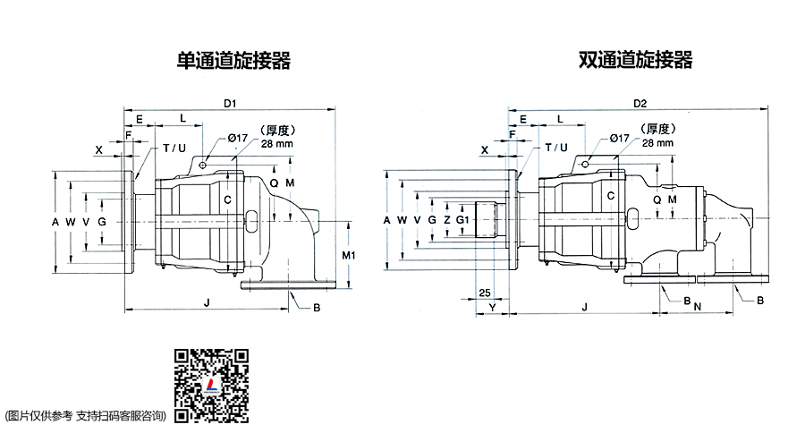 转接头工作数据 最高水压:150 PSI 10 bar 最高速度:750 RPM 最高温度:120 °C >120°C咨询杜博林 禁止在同时达到最高压力和最高速度的条件下运行。 如果运行条件存在临界,请咨询我们的工程部门。 旋转接头订货型号